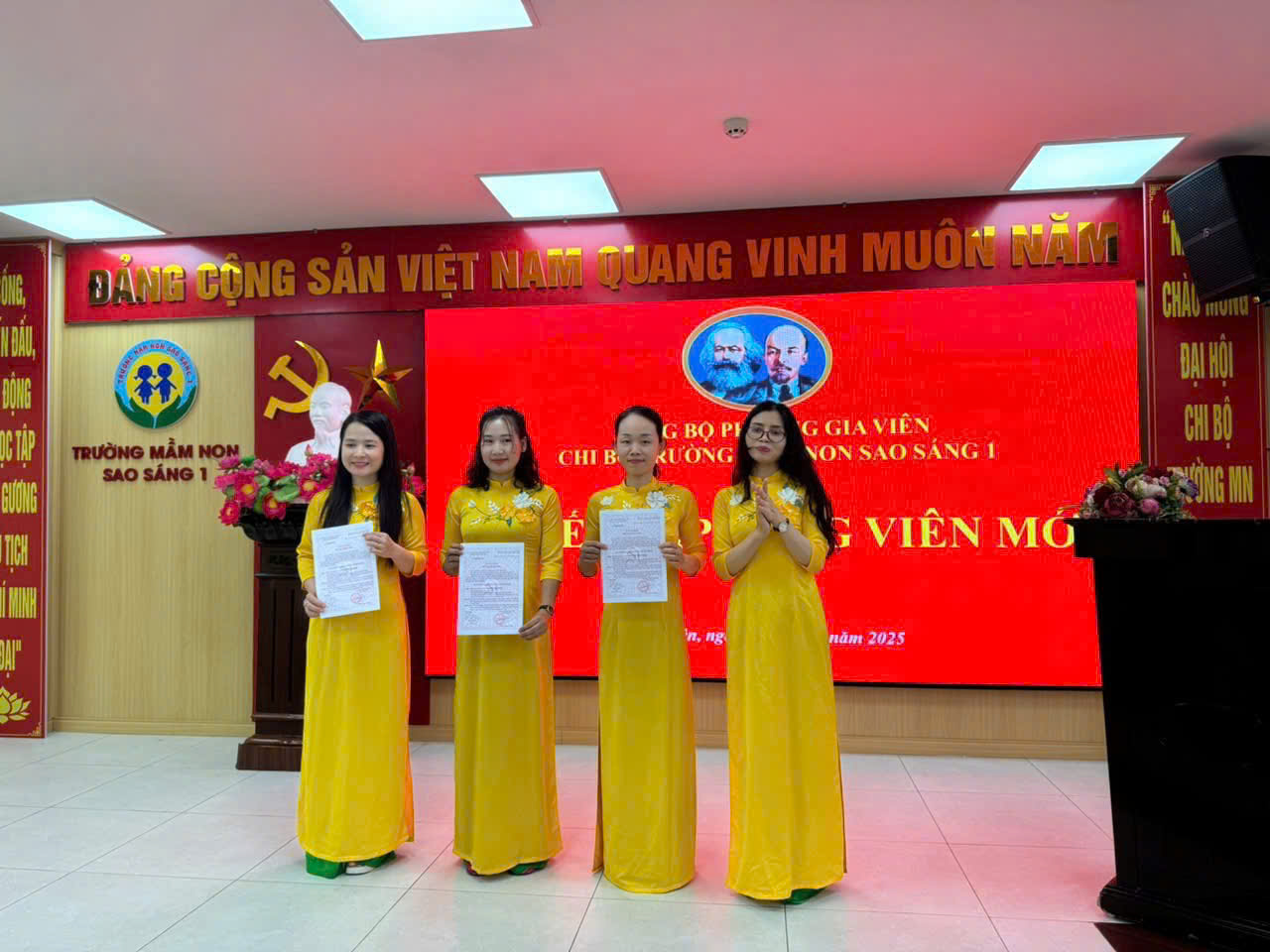 Thực hiện Điều lệ Đảng cộng sản Việt Nam, ngày 10/4/2025, Chi bộ Trường Mầm non Sao Sáng 1 long trọng tổ chức Lễ kết nạp đảng viên mới, đánh dấu một cột mốc quan trọng trong hành trình phát triển của nhà trường. Buổi lễ diễn ra trong không khí trang nghiêm, tràn đầy niềm tự hào và hy vọng 🎉🎉🎉