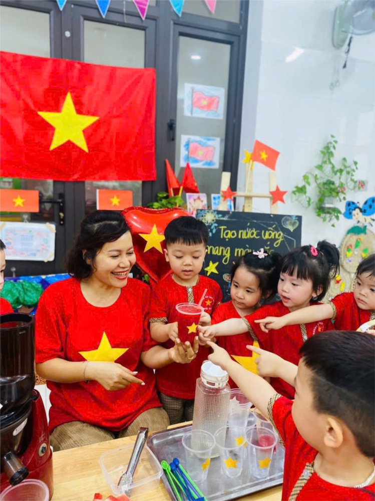 🌷 Ở hoạt động này, các bé được tự tay dán những ngôi sao vàng tươi lên chiếc cốc nhỏ xinh, sau đó cùng nhau rót đầy nước ép dưa hấu đỏ thắm, tạo nên lá cờ Việt Nam rạng rỡ. 🇻🇳