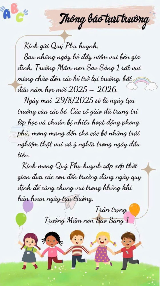Sau kỳ nghỉ hè đầy niềm vui bên gia đình, ngày mai 29/8/2025 các bé Trường Mầm non Sao Sáng 1 sẽ chính thức tựu trường! 🎉